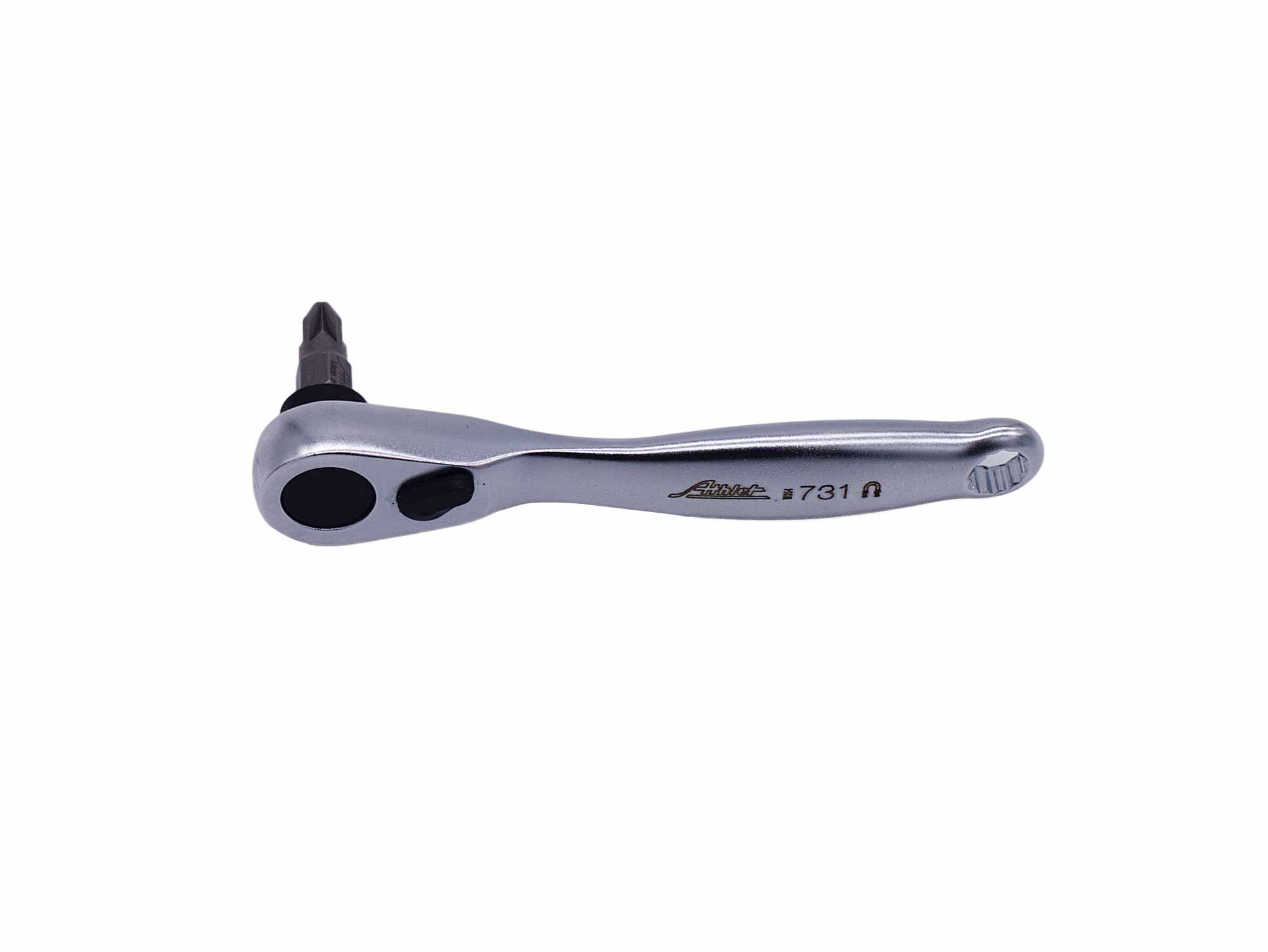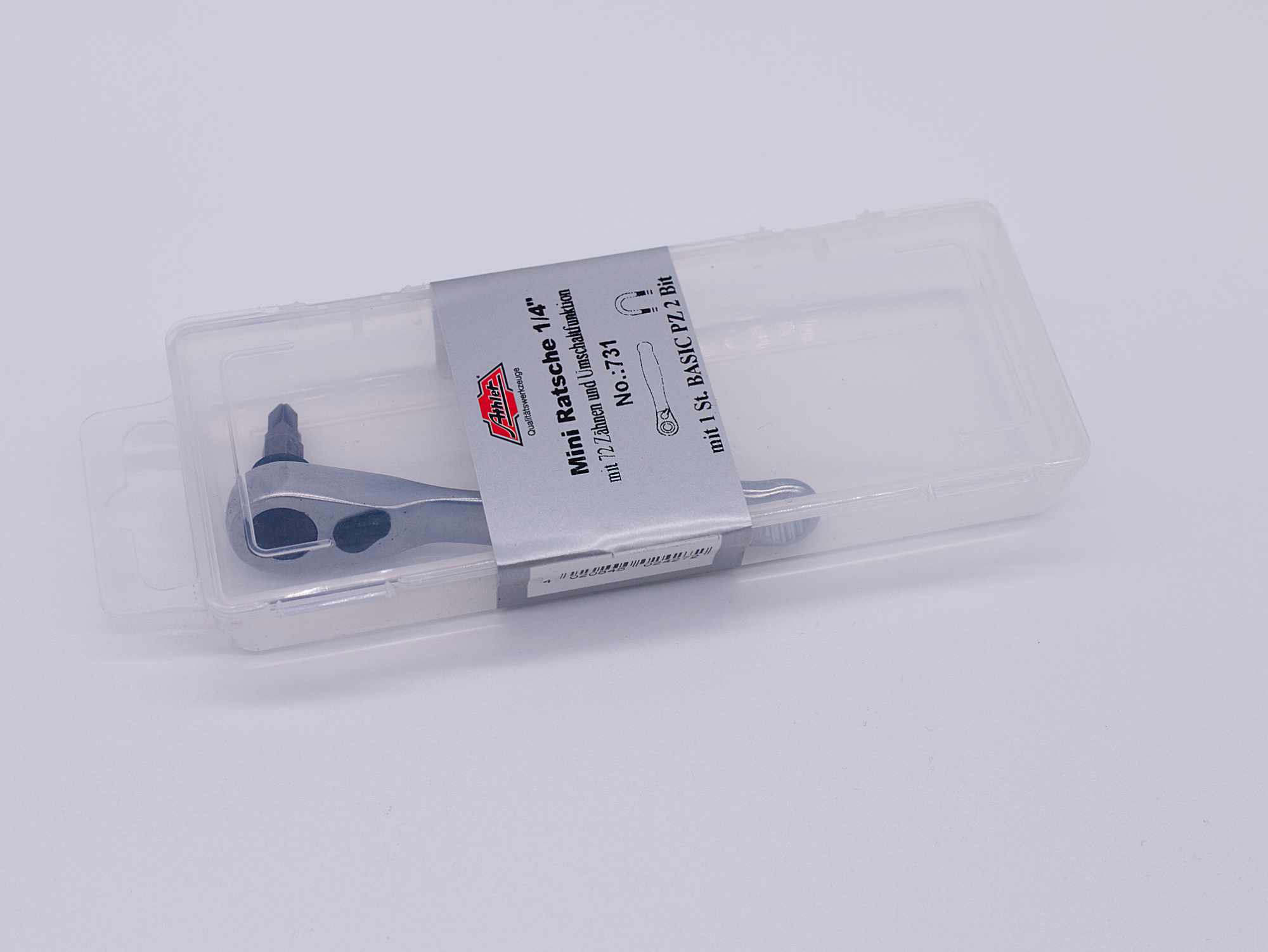 Umschaltfunktion Rechts / Links über kleinen Hebel auf der Ratschenoberseite. Der Schraubbit und magnetische Schrauben werden vom sehr starken Neodym-Magneten sicher gehalten. Lieferung inkl. PZ2 Bit